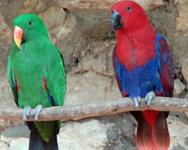 不拘一格的鸚鵡采用“一妻多夫”或“一夫多妻”制度,具有獨特的性二色性形式,雌性羽毛為紅色和藍色,雄性羽毛為綠色。為了吸引配偶,雌性可能會坐在腹部的開口處,露出鮮紅的羽毛。