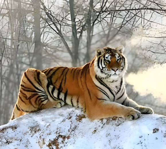 東北虎一般毛色較淺,冬季為乳黃色老虎的胸部腹部和四肢內(nèi)側(cè)的白色范圍較寬,身體上的深棕色條紋稀疏而淺色。完達(dá)山1號(hào)”體重450公斤,男,2歲-3歲,體壯。