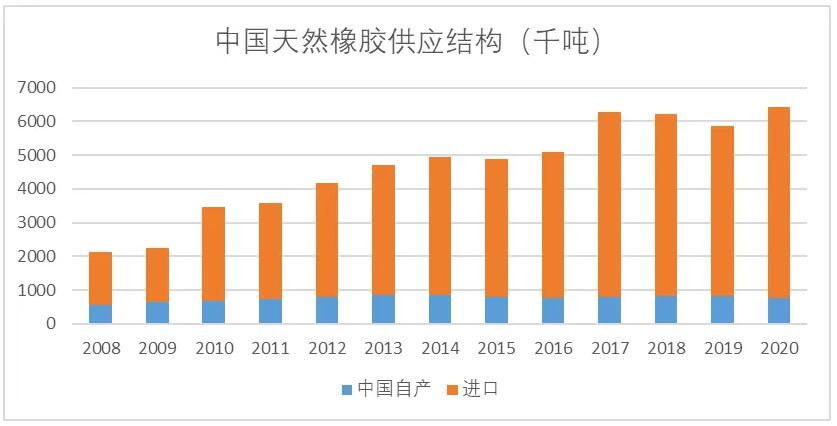 天然橡膠采自植物的汁液,雖然世界上有2000多種植物可生產(chǎn)天然橡膠,但大規(guī)模推廣種植的主要是巴西橡膠樹(shù)。采獲的天然橡膠主要成分是順式聚異戊二烯,具有彈性大、定伸強(qiáng)度高、抗撕裂性和耐磨性良好、易于與其它材料粘合等特點(diǎn),廣泛用于輪胎、膠帶等橡膠制品的生產(chǎn)。巴西橡膠樹(shù)喜高溫、高濕、靜風(fēng)、沃土,主要種植在東南亞等低緯度地區(qū)。受自然條件制約,中國(guó)僅海南、廣東、云南等地氣候條件可以種植,可用面積約1500萬(wàn)畝,已種植1400萬(wàn)畝左右,年產(chǎn)量在60萬(wàn)噸左右。