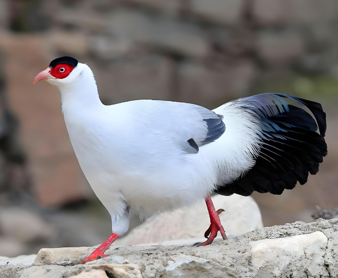 白馬雞是一種大型雞類,身體為白色或灰白色,尾巴為黑色,面部裸皮為紅色,頭部為黑色,耳羽簇短,尾羽下垂,在野外很容易辨認。