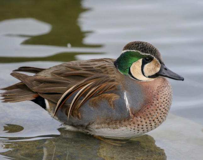 雄性成鳥(繁殖羽):公鴨 它的頭部和后頸呈深棕色,羽毛邊緣呈淺棕色。眼睛是黑色的,眼睛下方有向下延伸到喉嚨的黑色縱紋,縱紋兩側(cè)有乳白色的臉頰;有一條寬闊的祖母綠三角縱向條紋,延伸至眼后后頸下部;在后頸底部的中心和綠色帶狀斑點(diǎn)之間有一個(gè)三角形的黑點(diǎn);眉毛和脖子附近有白色細(xì)紋。頦、喉部和前頸部的上部呈深棕色。上背部和兩側(cè)呈藍(lán)灰色,點(diǎn)綴著深棕色波狀細(xì)紋。從下背部到上尾部的羽毛呈深棕色,帶有淺色的羽緣,上尾部的羽緣較淺。尾羽為褐色,有狹長(zhǎng)的棕白色羽毛。肩羽細(xì)長(zhǎng)醒目,內(nèi)有棕白色,外有絲絨黑色,有寬大的棕紅色羽邊,像流蘇一樣垂在肩上。翅膀上覆蓋著深褐色的羽毛,寬大的羽毛有寬大的褐色端斑,在翼鏡前形成褐色邊緣。二級(jí)飛羽上的翼鏡為銅綠色,向外緣逐漸變黑、白色;其他飛羽大多為深褐色,只有初級(jí)飛羽的頂點(diǎn)是深色的,外三級(jí)飛羽的外羽緣有一條褐色窄邊。腋羽純白色。胸部呈淺棕色,有黑色斑點(diǎn);腹部為純白色,尾部覆有深褐色羽毛,中部為棕白色,兩側(cè)側(cè)緣為厚褐色:下胸部?jī)蓚?cè)有一個(gè)白色的寬橫斑;下腹后面還有一個(gè)寬白斑,與其他鴨子不同。