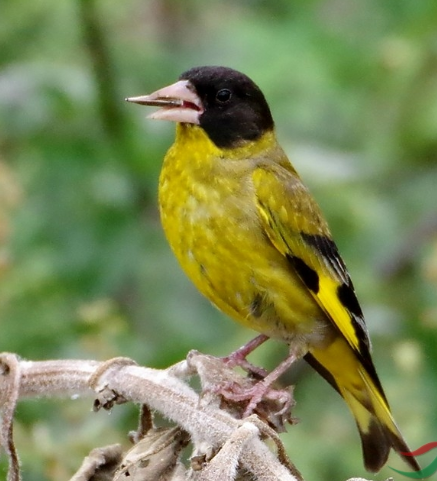 黑頭金翅雀是一種小型鳥類。體長方面,雄性為12~14.1厘米,女性11歲.5~14厘米;體重方面,男性1520g,女性1421g。黑頭金翅雀的前額、頭頂、頭側(cè)、頸部的背部和兩側(cè)是黑色的,上半身的肩部和背部主要是深棕色,點綴著橄欖綠。腰部和尾部的羽毛也是橄欖綠,腰部為黃色。它翅膀上的小羽毛是橄欖綠色的,而中間的羽毛是深橄欖黃色的羽毛邊緣,大羽毛是黑色的,帶有寬闊的淺灰色邊緣。黑頭金翅雀的主飛羽為深褐色至黑色,初級飛羽基部為鮮黃色,形成明顯的翼斑,末端為淡黃色和白色。中央尾羽為深棕色,其他尾羽基部為黃色、黑色合成的結(jié)束。它的下半身是橄欖綠色的,但喉嚨、胸、上腹部和下尾羽為亮黃色。它的虹膜是棕色的,嘴巴是淺粉棕色的。一般來說,男性和女性在外表上是相似的。但雌鳥的頭頂和頭側(cè)多為深褐色,也有少量淺色羽毛。幼鳥的外觀與雄鳥更相似,只是上下身體有深棕色的縱向條紋。