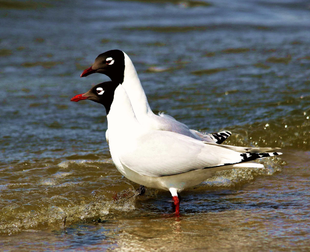 遺鷗(學(xué)名:Ichthyaetus relictus),又名釣郎,是一種鷗屬動物。遺鷗是一種中型水鳥,體長39 ~ 46厘米,體重500 ~ 600克。夏羽是一只成年遺鷗,頭部呈黑色,前額扁平,眼睛后邊緣上下各有一個月牙形白斑;肩、背部和翅膀的羽毛是淺灰色的,腰部是、尾羽和下半身為白色,外部初級飛羽為白色,具有寬的黑色亞末端斑點和白端斑點,其余飛羽為灰色。成年鳥的頭和脖子上有白色的冬季羽毛,耳朵上有黑斑;后頸部有一個橫向斑點。喙和蹼足暗紅色。