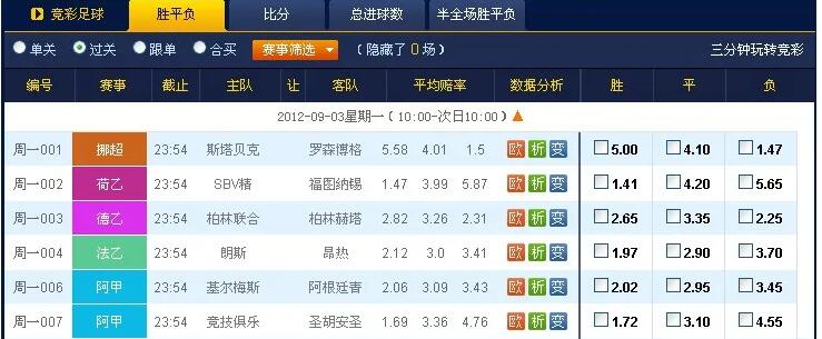 第一,同一比賽場次不同彩票游戲不能混合過關投注。也就是說,不能將同一場足球賽事的勝平負、總進球數(shù)、半全場勝平負、比分,或同一場籃球賽事的勝負、讓分勝負、大小分、勝分差進行混合過關。