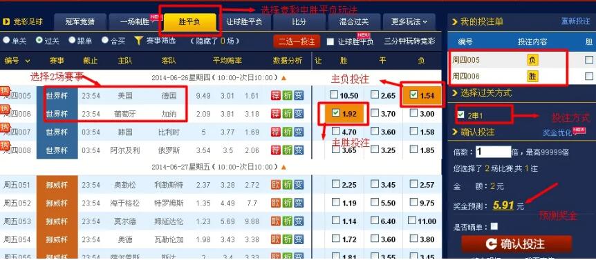 彩民選擇1場比賽進行投注的為單場投注;選擇2場或2場以上比賽進行串聯(lián)投注的為過關投注。在過關投注中,所選比賽的結(jié)果全部競猜正確才能中獎。