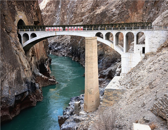 1954年底川藏公路順利通車時(shí),筑路部隊(duì)用水泥橋墩對(duì)鋼架便橋進(jìn)行了加固。1972年在原來的便橋旁邊又建起了一座新的水泥拱橋。