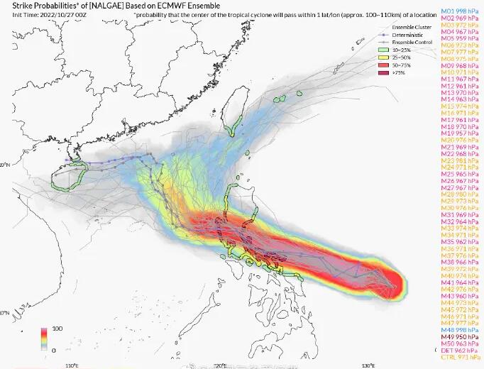 2022年10月27日8時,“尼格”的中心位于菲律賓馬尼拉東偏南方向約1240公里的海面上,強度為熱帶風(fēng)暴級(8級,18米/秒),中心最低氣壓為998百帕,預(yù)計“尼格”將以每小時15~20公里的速度向西偏北方向移動,強度逐漸增強,最強可達強臺風(fēng)級(14~15級,42~48米/秒),并將于31日前后進入南海中東部,之后轉(zhuǎn)向偏北方向移動。