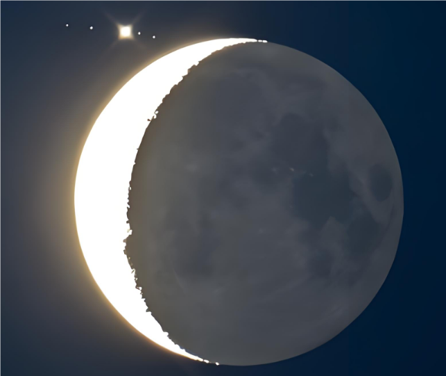 2009年3月23日一彎殘月如小船般飄蕩在天幕之上,彎月右下方不遠處,木星猶如月亮船上拋下的一顆明珠,閃閃發(fā)光。二者相依相偎,深情對望,為公眾奉獻一幕精彩的“星月童話”