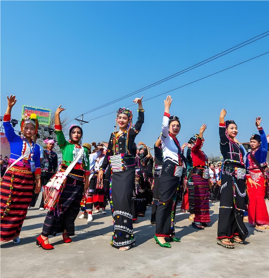 做擺:表演是一種偉大的致敬,這是德 昂人,一般在農(nóng)歷二月初二、三月份,在淡季的另一天舉行。以村為單位,祈求本村百姓平安生活,消災(zāi)。演出前,村里提前準(zhǔn)備了資金和食物,為遠(yuǎn)近其他寨子的參與者提供住宿。第一天是迎佛,第二天是拜佛佛祖會(huì)念《長(zhǎng)拉尼亞經(jīng)》,讓大家年年有吃有喝,年年有錢。最后一天,客人走了,寨子里的人聚在一起,載歌載舞。