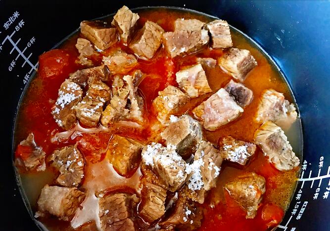 2、準備一個電飯煲或者砂鍋,最底部放洋蔥,接著放番茄,最上面放牛肉塊,加入足量的開水,舀入適量的食鹽。