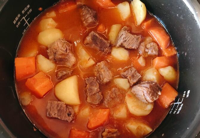 3、燉煮一個半小時以后,打開電飯煲,此時的牛肉已經(jīng)軟爛鮮香了,嘗一嘗咸味,看是否需要補充咸味,其它調(diào)味品不用放。