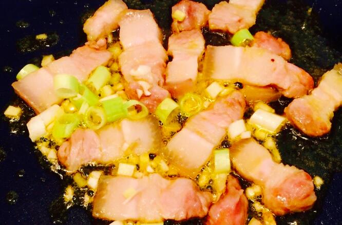 1、準備一塊帶皮五花肉,肥瘦均勻,改刀切成片,起鍋燒油,油熱放入蔥姜末,爆出香味。