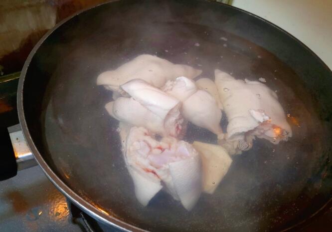 2、起鍋燒水,涼水下入豬蹄,放入料酒去腥,沸騰幾分鐘以后,撈出沖洗干凈。