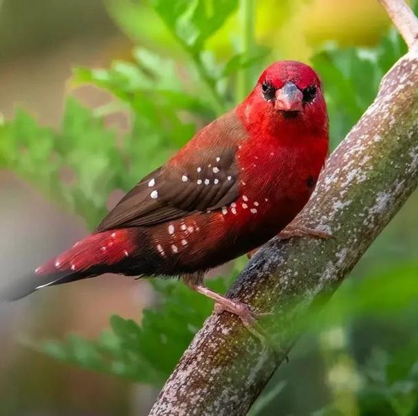 紅梅花雀,學(xué)名為Amandava amandava,隸屬于梅花雀科,紅梅花雀屬。這類小型鳥類體型適中,體長在9至10厘米,體重約7至8克。其性別在外觀上有所區(qū)別,雄鳥和雌鳥顏色各異。雄鳥在繁殖期全身呈現(xiàn)朱紅色,肩背、兩脅、腰以及兩翼上點綴著均勻的白色小點。雌鳥則上體為淡褐色,腰部和尾上覆羽為紅色,其他部分為灰皮黃色,白色點斑較少,散布在兩翼。