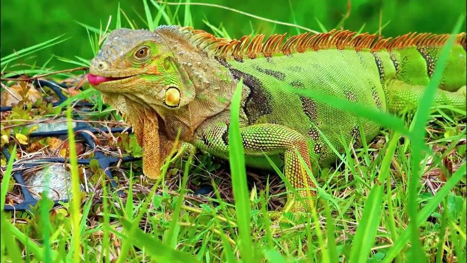 綠鬣蜥,學(xué)名Iguana iguana,屬于美洲鬣蜥科美洲鬣蜥屬的爬行動(dòng)物。作為美洲體型最大的蜥蜴之一,綠鬣蜥體型細(xì)長(zhǎng),平均長(zhǎng)度可達(dá)1.98米,雄性個(gè)體最長(zhǎng)可超過2米;其尾巴長(zhǎng)度遠(yuǎn)超頭和身體總和,有時(shí)甚至達(dá)到頭體長(zhǎng)的兩倍;平均體重約為4.99千克,雄性個(gè)體體重最大可超過6千克,而雌性個(gè)體體重約為雄性的一半。幼年時(shí)期的綠鬣蜥全身呈現(xiàn)鮮艷的綠色,成年后主體顏色仍為綠色。它們擁有大眼睛,頭部背中線眼眶處有一只頂眼,這是一種光感覺器官。耳部下方有圓形的大鱗片,喉部有發(fā)達(dá)的喉囊,成年雄性的喉囊比雌性更為發(fā)達(dá)。它們的軀干上有時(shí)可見不明顯的不規(guī)則斑紋,尾巴上則帶有黑色間斷的條紋;成體從背部到尾部有一排梳狀鼠鱗。