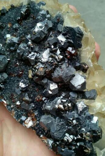 閃鋅礦,菱形十二面體完全解理、光澤以及與方鉛礦密切共生;閃鋅礦因?yàn)轭伾兓艽?,所以不易鑒定,不過卻仍然可以從它的光澤和解理當(dāng)中,予以判別;一些暗黑色的,叫黑閃鋅礦(BlackJack),條痕多紅棕色,常較其本身整體的顏色為淺。