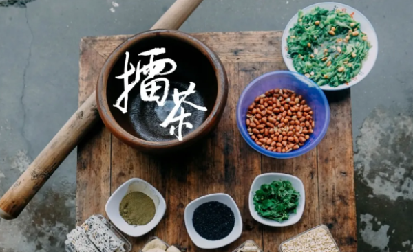 擂茶制作雖復(fù)雜,但操作簡便。首先將準(zhǔn)備好的綠茶茶葉放入擂缽中,用半米長的擂棍頻繁舂搗并旋轉(zhuǎn),同時加入其他材料直至搗碎。然后加入沸水沖泡,講究時可篩濾茶料再加水煮沸。擂茶具有生津止渴、清涼解暑以及健脾養(yǎng)胃和滋補(bǔ)長壽的功效。