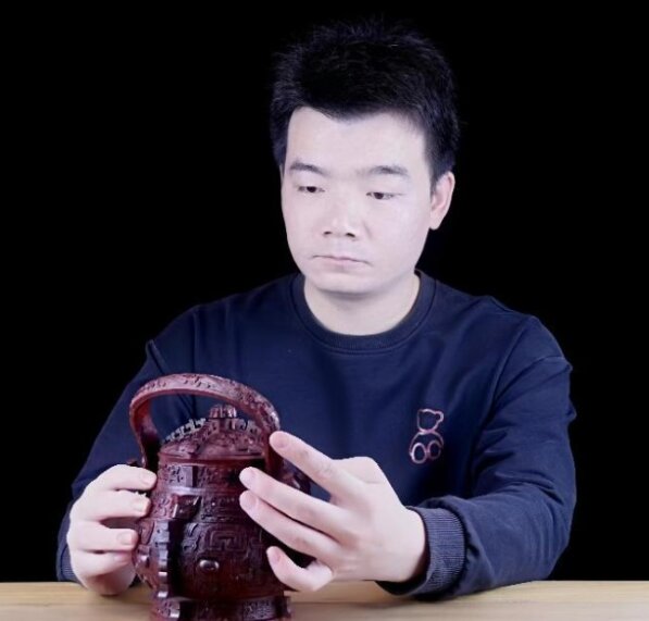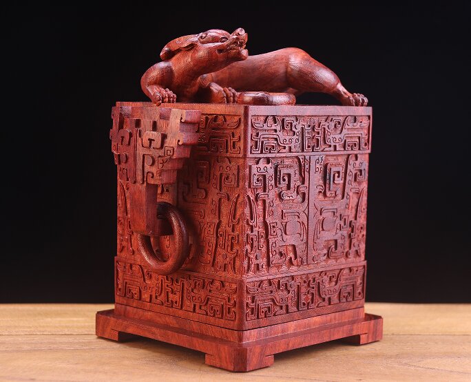 創(chuàng)作設(shè)計(jì):尊,在古代多為青銅制,主要用于盛裝美酒,也是中國(guó)古代青銅器的重要器皿之一,也是古代王公貴族所擁有的,象征著其地位的尊貴,也是古代祭司時(shí)所用的重要禮器,特別受古人尊重,因此“尊”字又引用出尊重、尊貴、尊敬等由尊而起的詞,并沿襲至今。今用小葉紫檀,青銅化木制器,致敬古代匠人超高的技術(shù)水平和匠人精神。作品選用上好的小葉紫檀一木成器,在商周青銅紋飾的基礎(chǔ)上結(jié)合現(xiàn)代手工刀具使其紋飾更具立體感,紋理更加細(xì)膩整潔。然因是木制,雖不具備盛裝美酒,亦可當(dāng)做筆筒使用,既是一件藝術(shù)品擺件,也是一件極具美感的實(shí)用器。