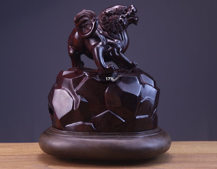 創(chuàng)作設(shè)計(jì):狻猊香薰,作品分兩部分,上為蓋,下為底,蓋由紫檀制,創(chuàng)作思路,利用材料的自然空洞做為香薰的煙道,上刻一尊昂首挺胸神獸狻猊,狻猊是中國(guó)古代神話(huà)中的神獸,也是龍生九子中的第五子,其形似獅,喜煙火,常被用來(lái)裝飾在香爐上,也是佛或菩薩的坐騎,護(hù)法獸。揭開(kāi)上蓋,其下為底,底用金絲楠陰沉木制,水波紋理波光粼粼,上置防火棉,點(diǎn)盤(pán)香,整體意境表現(xiàn)甚佳,在佛教中供奉狻猊可以增加福報(bào)和功德。