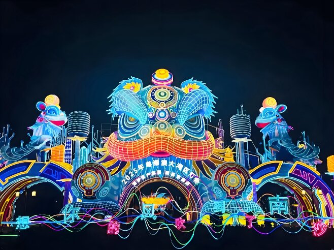 這個園區(qū)用賽博朋克風格引領(lǐng)科幻與傳統(tǒng)新風潮,打造了時尚潮玩世界和年輕人的二次元虛擬世界。燈組“齊天大圣”以金屬線條勾勒輪廓,金箍、火眼金睛、如意金箍棒等細節(jié)栩栩如生。在燈會2號門附近,“賽博醒獅”以超大型天穹式大門組燈的形式,將傳統(tǒng)舞獅與現(xiàn)代科技、未來主義朋克風格相融合,彰顯出大灣區(qū)的創(chuàng)新活力。