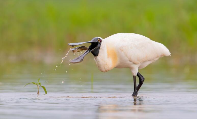 黑臉琵鷺主要以小魚、蝦、蟹、昆蟲以及軟體動物等為食。 覓食地點在淺水地帶,水位不會太淺,通常在20~30厘米,最深只能到腹部的羽毛。 它們覓食時,采取群體圍捕的方式,用力踩水,將魚群集中趕到一處水域, 然后將喙的先端探入淺水中并張開,一邊行走一邊左右晃動頭部,通過喙的觸覺掃探魚等食物。捕到食物后,它們就用喙將食物帶離水面,將食物吞下。