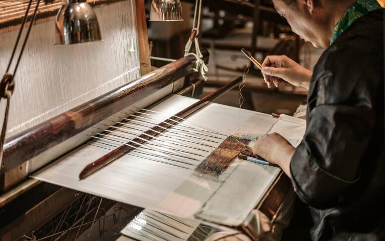 云錦獨特的老式提花織機織造工藝發(fā)展需要提花機和織布機的結合,他們自己每天我們只能通過生產(chǎn)5-6厘米,這一傳統(tǒng)工藝尚未被機器可以取代。