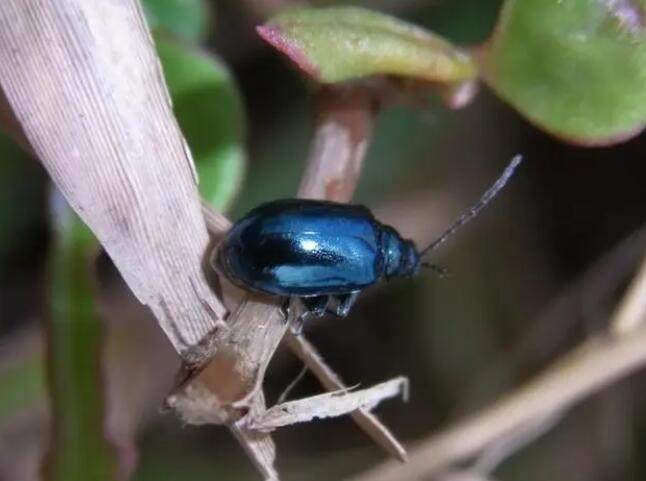 藍跳甲蟲藍黑色或藍色帶綠光;觸角是黑色的,兩個基部的頂端是褐色的。頭頂光滑,無皺紋,額部腫瘤圓而突出,觸角間嵴上部厚而寬,下部窄。觸角大約是身體長度的2倍/3較粗,第三節(jié)節(jié)約的是第二節(jié)長度的1.5倍,以下各節(jié)比第三節(jié)長。