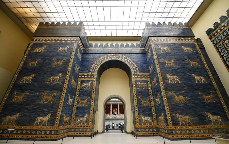 伊斯塔門收藏在古代近東博物館。該門建于尼布甲尼撒二世統(tǒng)治時期(從公元前604年到公元前562年)這是曾經(jīng)通往巴比倫的八道門之一。20世紀初,德國人在伊拉克考古過程中挖掘出城門的碎片,運回德國,在伊拉克斯塔爾恢復(fù)重建城門。斯塔爾之門建成時有12米高,瞭望塔將近30米高。在每個瞭望塔的墻上,都有一個缺口,叫做炮門垛。大門上覆蓋著藍色琉璃瓦,上面用黃色白色和棕色雕刻著古代宗教中的動物,如公牛獅子和龍,象征著古巴比倫的古代神靈。