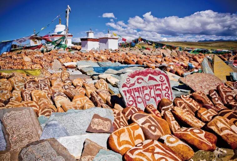 這里的摩尼石上刻有佛經(jīng)和佛像,高2米多,宛如一座巨大的摩尼石經(jīng)城石城門巷掛滿彩旗,城內(nèi)佛塔高聳。藝術(shù)家 雕刻技術(shù)受勒巴溝 唐代石雕,雕刻方法靈活多變。這里的摩尼石雕顏色采用藏族傳統(tǒng)尹銘所說的——“根本顯色為青(藍(lán))黃赤(紅)白四種。樹枝分八種,分別是云霧,陰影明暗。這種配色在整個藏區(qū)都不多見,具有獨(dú)特的藝術(shù)研究價值。