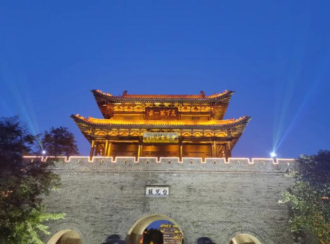 《迎賓秀》演出場地位于臺兒莊古城東門,是運河文化系列、以戰(zhàn)爭文化為主線的城墻光影表演位于東門,表演時長5分鐘,通過聲光、測繪等現(xiàn)代技術(shù)手段講述臺兒莊的前世故事。