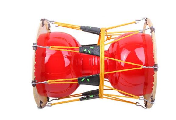 左右鼓面縫在直徑約41~48 cm的兩個(gè)鐵圈上,分別蓋在左右兩端的鼓口上鐵環(huán)周圍分別安裝八個(gè)鐵鉤橡膠條或鼓繩,相鄰兩繩之間放一個(gè)可調(diào)節(jié)的活動(dòng)皮套,以調(diào)節(jié)鼓面的張力皮套也叫浮動(dòng)旋轉(zhuǎn)。鼓體外表面涂有紅漆,并繪有金色圖案作為裝飾;鼓槌長約40厘米,由細(xì)竹條制成,杵頭略大。