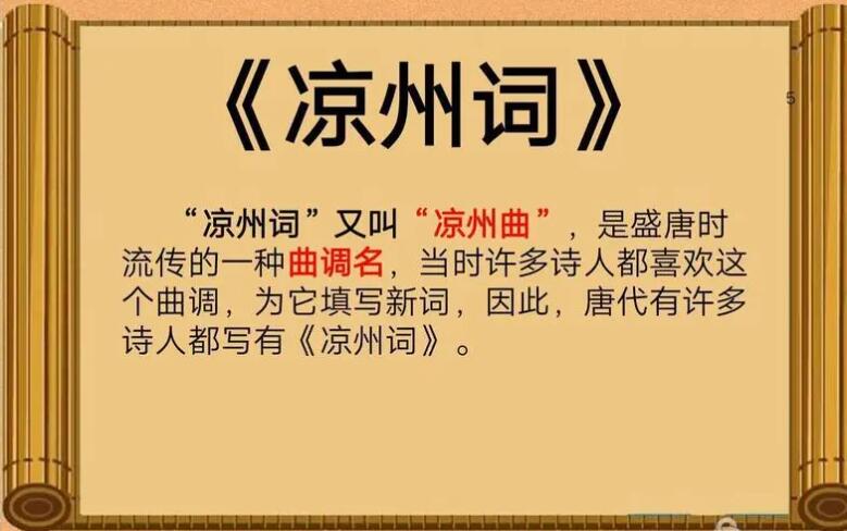 涼州詞(Liangzhou )又稱涼州歌,是為涼州歌所作的一首抒情詩,是唐代流行的曲調之一名字中的涼州位于中國甘肅省武威市,因地處西部,常年寒冷而得名其代表作是《涼州詞》。