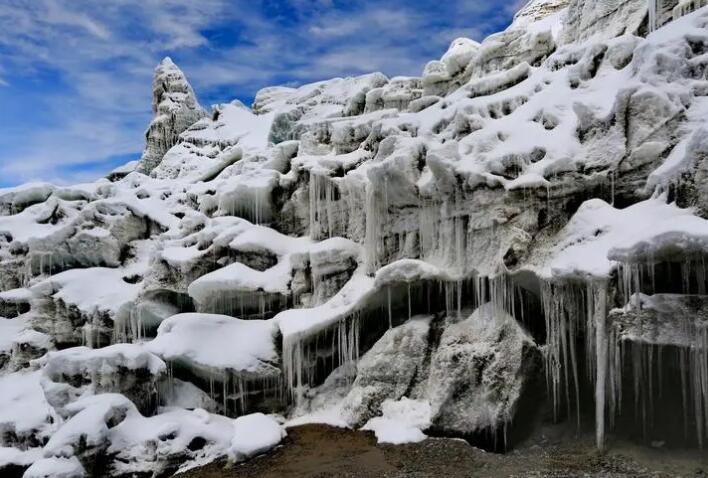 普若崗日冰川是除南極和北極之外的世界第三大冰川,巨大的白色冰蓋覆蓋著山脈和各種形狀的冰塔、圓形的冰蘑菇和連續(xù)的冰墻晶瑩剔透,氣勢恢宏。
