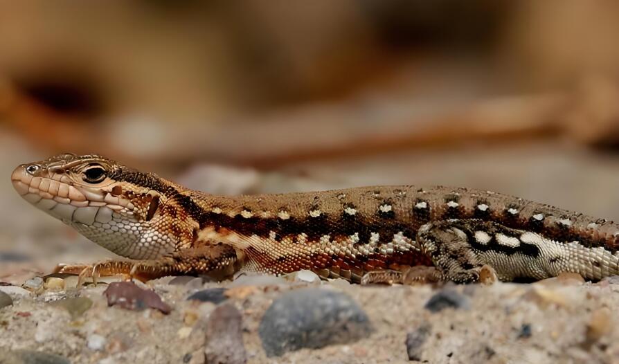 身體和尾巴細(xì)長(zhǎng)扁平的小蜥蜴。體長(zhǎng)10~15厘米,尾長(zhǎng)為頭長(zhǎng)的1.5倍。鼻尖長(zhǎng);鼻鱗有3個(gè),上鼻鱗最大;額鱗2對(duì),三角形,彼此相連;亞眶鱗3枚,中間一枚最長(zhǎng),表面有一弧形突起,延伸于唇鱗間,但不達(dá)口緣。背部為黃褐色或淺褐色,但在不同環(huán)境下體色會(huì)有所不同(通過(guò)改變體色可以調(diào)節(jié)對(duì)光的吸收,進(jìn)而調(diào)節(jié)體溫;利于躲避敵人和覓食),背部和肋部有數(shù)排縱向排列的白色圓形斑點(diǎn),圓形斑點(diǎn)周?chē)猩詈稚吘?;背部覆蓋有突出的顆粒狀鱗片。身體兩側(cè)各有一條深棕色的縱帶;四肢五(指)趾,有爪;每側(cè)有9~12個(gè)股窩,股窩間有6~8個(gè)鱗片。腹面黃白色,腹鱗呈長(zhǎng)方形,斜列呈瓦片狀。除了基部的腹面,尾巴上覆蓋著堅(jiān)固的棱形鱗片。